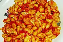 Suckling pig and wild boar are roasted on the spit or boiled in stews of beans and vegetables, thickened with bread. Herbs such as mint and myrtle are widely used in the regional cuisine. Sardinia also has many special types of bread, made dry, which keeps longer than high-moisture breads.[3] Malloreddus is a typical pasta of the region.