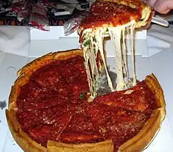 Italian-American cuisine continued to flourish in Chicago as American forces returned from World War II with a taste for Italian foods. Pepper- and onion-topped Italian pork sausage sandwiches became widely available, and can still be found at festivals, fairs, and ballparks today.[7] Thin-crust pizza arrived in Chicago with Italian immigrants as early as 1909; according to some, the iconic Chicago deep-dish pizza dates to 1943 when it first appeared on Pizzeria Uno menus.[17] Italians are also known for Chicken Vesuvio, bone-in chicken sauteed with oregano and garlic in white wine sauce and finished in the oven with potatoes.[16]