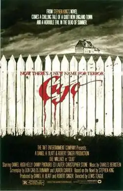 Cujo is a 1983 American horror film based on Stephen King's 1981 novel of the same name, directed by Lewis Teague. It was written by Don Carlos Dunaway and Barbara Turner (using the pen name Lauren Currier)[4][5] and stars Dee Wallace, Daniel Hugh Kelly and Danny Pintauro. The film follows a mother and her son who are trapped inside their car while protecting themselves from a rabid St. Bernard. It was released in August, four months before Christine, another Stephen King story released theatrically the same year.[6]