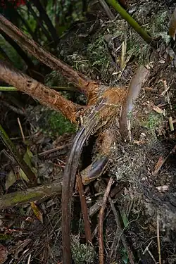 Culcita macrocarpa is a large plant that can reach up to 2 metres (6.6 ft) in height[3] and has fronds up to 2 metres (6.6 ft) long. Its rhizomes are thickly coated with long silky, light brown hairs. Stipes are one third of the blade length, it has glabrous stabs and rachis and a shiny green, leathery, triangular blade on top. Serums are protected by the blade's curved lobes.[4]