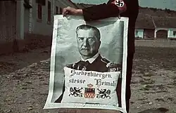 Starting in the 1920s, during the early years of the Nazi Party, Nazi propaganda began to depict the Nazi leader Adolf Hitler as a demagogue figure who was the almighty defender and savior of Germany. After the end of World War I (1918) and the Treaty of Versailles (1919), the German people experienced turmoil under the Weimar Republic, and, according to Nazi propaganda, only Hitler could save them and restore Germany's greatness, which in turn gave rise to the "Führer-cult".[105] During the five election campaigns in 1932, the Nazi newspaper Völkischer Beobachter portrayed Hitler as a man who had a mass movement united behind him, a man with one mission — to solely save Germany as the 'Leader of the coming Germany'.[106] The Night of the Long Knives in 1934 – after which Hitler referred to himself as being single-handedly "responsible for the fate of the German people" – also helped to reinforce the myth that Hitler was the sole protector of the Volksgemeinschaft, the ethnic community of the German people.[107]