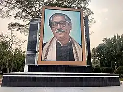 Mujibism initially began as the political ideology of Sheikh Mujibur Rahman ("Mujib", 1920-1975), who led Bangladesh's secession from Pakistan in 1971. From 2008 onwards, Mujib's daughter, Sheikh Hasina, gradually converted Mujibism into a cult of personality around her father.[31][32] After being pushed to the sidelines by two successive military dictators —Ziaur Rehman (who founded the Bangladesh Nationalist Party) and Hussain Muhammad Ershad (who founded the Bangladesh National Party) — the figure of the late Mujib returned to dominate public consciousness from 2008 under the Awami League government led by Hasina. Hasina has been criticised for overemphasising the role of her father and of the Awami League in securing Bangladeshi independence at the cost of sidelining other prominent figures and political parties of the time.[33] Hasina had amended the constitution to make the presence of Mujib's portrait mandatory in every school, government office and diplomatic mission of the country; and made it illegal to criticise Mujib, his ideals or his deeds, especially the one-party BAKSAL regime (1972–75) headed by him, through writing, speech or electronic media. Many events commemorating the birth-centenary of Bangabandhu ('Friend of Bengal' in Bengali, the honorific unofficial title given to Mujib in his lifetime) were launched by the Hasina administration, including an official biopic in collaboration with the Indian government. The Hasina government converted Mujib's residence in the capital city of Dhaka, where he and his family were assassinated by mutinous military personnel in 1975, into a memorial museum. Hasina designated the day of Mujib's assassination as the National Day of Mourning.[34][35] The Hasina government also made the birthdays of Mujib, his wife Sheikh Fazilatunessa, eldest son Sheikh Kamal and youngest son Sheikh Russel as official government holidays, alongside March 7 (on that day in 1971, Mujib declared Bangladesh's secession at a speech in Dhaka). Under Hasina's rule, the country was dotted with numerous statues of Mujib alongside several roads and prominent institutions named after him. Critics state that Hasina utilised the personality cult around her father to justify her own authoritarianism, crackdown on political dissent and democratic backsliding of the country.[36] Following the violent overthrow of Sheikh Hasina in 2024, the cult of personality around Mujib is being systematically dismantled.[37][38]