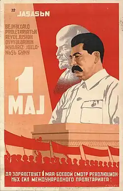 One key element of Soviet propaganda was interaction between Stalin and the children of the Soviet Union. He was often photographed with children of different ethnic backgrounds of the Soviet Union and was often photographed giving gifts to children. In 1935 the phrase, "Thank You, Dear Comrade Stalin, for a Happy Childhood!" started to appear above doorways at nurseries, orphanages, and schools; children also chanted this slogan at festivals.[150] Another key element of Soviet propaganda was imagery of Stalin and Lenin. In many posters, Stalin and Lenin were placed together to show their camaraderie and that their ideals were one. Throughout the 1930s, posters with both images were used as a way to bring the nation and the military together under the policies of the Communist Party during World War II, with the idea of Lenin as the father of the revolutionary ideas and Stalin as the disciple who would fulfill the communist ideals.[145] Stalin was also portrayed in numerous films produced by Mosfilm, which remained a Soviet-led company until the fall of the Soviet Union.
