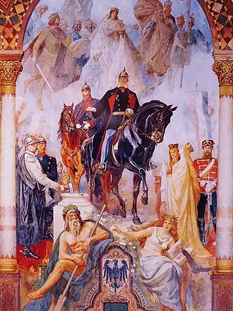 - Other than the Kyffhäuser Monument mentioned above, during the early years of the German Empire, an iconographical program which associated Frederick with Wilhelm I was carried out in Goslar, centred on the old Kaiserpfalz (Imperial Palace). A famous equestrian statue of Frederick Barbarossa, built by Robert Toberentz (1849–1895) in 1893–1895 and erected until 1900, stands in Goslar, with Wilhelm's statue standing nearby (Frederick on the North, Wilhelm on the South). The Kaiserpfalz was decorated with paintings depicting the life of Frederick too,[108][109][110][111] presided over by Johannes Wislicenus, who combined history wỉth fairytale (the German nation as the Sleeping Beauty, or Dornröschen) and saga (the Barbarossa legend), the medieval with the modern.[112] In The proclamation of the Reich, Frederick looked down with approval at the proclamation while Queen Luise was presented as Germania.[113] Other paintings in this program include: Barbarossas Erwachen (Barbarossa awakened), Barbarossas Fußfall vor Heinrich dem Löwen (Barbarossa falling on his knees in front of Henry the Lion, which describes Frederick begging Henry at Chiavenna for military aid against the Lombards in 1176.), Barbarossas Sieg bei Ikonium (Barbarosa's victory in Iconium), Heinrich der Löwe bittet Barbarossa um Verzeihung (Henry the Lion begged Barbarossa for forgiveness, which describes the event in Erfurt in 1181).[114]