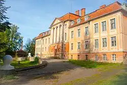 The eastern part of the current Kaliningrad Oblast was part of the region of Lithuania Minor, traditionally inhabited by Lithuanian people, and preserved Lithuanian heritage is thus mostly located there. In Chistye Prudy (Lithuanian: Tolminkiemis), there is a Memorial Museum of Kristijonas Donelaitis, author of The Seasons, the first Lithuanian poem. Several churches, which hosted Lithuanian services for the region's Lithuanian population in the past, are located in the province, including the preserved churches in Bolshakovo (Skaisgiriai), Chistye Prudy (Tolminkiemis), Slavsk (Gastos), Saranskoe (Laukiška) and Telmanovo (Didlaukiai), and the either partially preserved or ruined churches in Chernyshevskoye (Eitkūnai), Glushkovo (Plybiškė), Kalinino (Mielkiemis), Krasnogorskoye (Nybudžiai), Krylovo (Ašvėnai), Lermontovo (Išdagai), Mayakovskoye (Nemirkiemis), Mayovka (Jurbarkas), Mezhdurechye (Narkyčiai), Ozyorsk (Darkiemis), Pushkino (Gėritai), Ulyanovo (Kraupiškas), Vesnovo (Kusai), Volodarovka (Juodlaukiai), Vysokoye (Papelkiai) and Yablonovka (Klikučiai).[8] The Lithuanian Church in Sovetsk (Tilžė), traditional capital of Lithuania Minor,[9] was destroyed by the Soviets in 1951–1952. The Catholic parish church at Sackheim in Kaliningrad (Karaliaučius), the oldest post-Reformation Catholic church in Königsberg, which hosted Lithuanian services,[10] was destroyed in the 1960s. Several other such churches were destroyed after the war, including in Chernyakhovsk (Įsrutis), Chkalovo (Enciūnai), Gavrilovo (Gavaičiai), Kalinovka (Aulavėnai), Mayskoye (Malviškiai), Polessk (Labguva) and Sadovoye (Balėtai).[11]