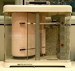 An ongoing monitoring system is essential to the preventive care of objects in collections storage, as it helps to identify any problems, evaluate the effectiveness of corrective measures, and document the effect of extraordinary events such as water leaks, long periods of drought, or heavy rains.[4] Hygrothermographs are a tool that constantly monitors both the temperature and relative humidity, and are fairly reliable if properly calibrated, a task that must be completed at least every three months if not more frequently.[4] The value with these devices is that they constantly record the data onto graphs that can be analyzed at a later time. Hygrometers, thermometers, and thermohygrometers are also useful for determining the temperature and relative humidity of a space, but the most reliable tool is a psychrometer.[4] Data loggers are becoming more popular in institutions as they are small, record data at desired intervals, and allow the data to be easily transferred to a computer in multiple formats including graphs and tables, which allows for easy collection and assessment of the data.[4]