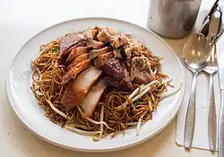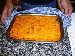 Besides the casserole pom, roti (often served with a filling of chicken curry, potato and vegetables) is also often served on festive occasions with many guests. Other well-known dishes are moksi-alesi (mixed boiled rice with salted meat, shrimp or fish, and any vegetable), rice and beans, peanut soup, battered fried plantain, bara and the original Javanese nasi goreng and mie goreng.