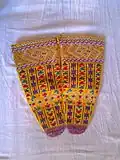 Some items of traditional clothing worn by women include the fustan or dress, atop with a multicoloured embroidered peshtelka or front apron.[1] A dollomba (Standard Albanian: dolloma) or long dress robe of a red colour with heavily embroidered patterned sleeves and chest area of yellow or silver white thread was considered a major item of clothing for women.[1] Muslim women, when outside, also wore a black or navy blue coloured ferexhja or hijab with a multicoloured embroidered chest area.[1] Also worn was a xhybeli or sleeveless vest with heavy yellow embroidery along the chest and neck area and a mitan (mintan) or tight fitting (often black) coloured vest, with heavy embroidery along the sleeves.[1] The tazlluka/t, or lower knee padded stockings are heavily embroidered on either black or red cloth and are worn above the multicoloured patterned kalçin/t or socks.[1] Jewelry worn consisted of a fshtura which is a silver or gold plate with engraved patterns alongside dangling coins fastened around the waist.[1] A qysteku or silver necklace with a dangling ornament is worn around the neck, while Orthodox Christians still wear a silver krysh (kryq) or cross necklace.[1][3] Elaborate headdresses for special occasions like the veshkat are worn on the forehead made up of rows of dangling silver coins and patkojt worn on the back with additional ornaments and decorations.[1] Young girls sometimes wear a kunora (kurorë) or laurel crown made of flowers.[1] A multicoloured korpa (shami) or headscarf is also worn.[1] Women mainly wear their hair in kërcajshe or multiple ponytails often consisting of 5 to 8 plaited braids depending on age worn at the back of the head.[1]