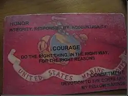 The Marine Corps Core Values of Honor, Courage, and Commitment have gained increased prominence in recent years.[4][5] As an emphasis on performing morally on and off duty, the concept of core values has infiltrated into many aspects of Marine life, beginning in recruit training and continuing into combat.[6] This "warrior ethos" provides guidance to Marines in difficult ethical situations and acts as a reminder to provide good order and discipline.[7]