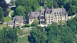 In 1882, George V's son, Ernest Augustus (1845–1923), Crown Prince of Hanover, and 3rd Duke of Cumberland and Teviotdale, decided to build his own castle.[1] He acquired land near the Queen's Villa on a hill north of the centre of Gmunden above the Krottensee. He commissioned the Hanoverian architect Ferdinand Schorbach to design a castle in gothic revival style.[2]