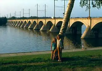 The present concrete structure was completed about 1916, and President Woodrow Wilson was one of the first to travel over the newly constructed bridge.[3] Traffic on the bridge ceased in the late 1980s after the Cumberland Valley Railroad was purchased by Conrail.[4] Although the majority of the bridge has been abandoned for rail use, other uses for the bridge have been suggested, such as becoming the principal crossing for the Corridor One rail commuter system to serve the renewed rail needs of the metropolitan area and of Harrisburg's west shore. Alternate ideas have also included opening the bridge solely for express bus and emergency vehicle traffic.[5] Two of these are the railroads on either side which continue to operate on the tracks immediately off of the bridge on either side. The third owner is Capital Area Transit which currently does not own any property with immediate access to the bridge.[6] Immediately to the south of the Cumberland Valley Bridge, a similar iron truss structure was erected in 1891 by the Reading Company, originally known as the Philadelphia and Reading Railroad.