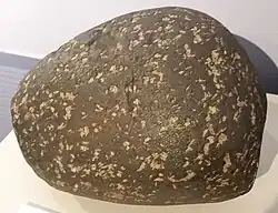 Cumberlandite is a specific type of plutonic rock called a melanocratic troctolite, or melatroctolite.[1] It is the state rock of Rhode Island and can be found in a 4-acre (0.016 km2) lot in Cumberland, Rhode Island at Iron Mine Hill.[2][3] Further traces can be found scattered throughout the Narragansett Bay watershed as far as Martha's Vineyard.[4] Cumberlandite is not exclusive to Rhode Island, but is also found in Taberg, Sweden.[5] It is slightly ferrimagnetic due to its high concentration of iron.