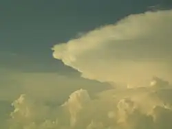 Cumulus supplementary features are most commonly seen with the species congestus. Cumulus virga clouds are cumulus clouds producing virga (precipitation that evaporates while aloft), and cumulus praecipitatio produce precipitation that reaches the Earth's surface.[25] Cumulus pannus comprise shredded clouds that normally appear beneath the parent cumulus cloud during precipitation. Cumulus arcus clouds have a gust front,[26] and cumulus tuba clouds have funnel clouds or tornadoes.[27] Cumulus pileus clouds refer to cumulus clouds that have grown so rapidly as to force the formation of pileus over the top of the cloud.[28] Cumulus velum clouds have an ice crystal veil over the growing top of the cloud.[19] There are also cumulus cataractagenitus, which are formed by waterfalls.[29]