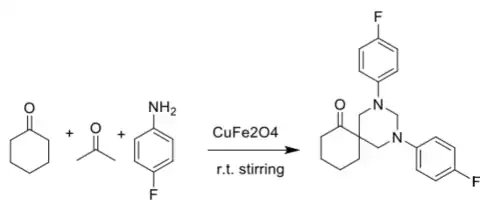 Nano CuFe2O4 can be utilized as a catalyst in a one-pot synthesis of fluorine containing spirohexahydropyrimidine derivatives. It has also been observed that the catalyst can be reused five times without significant loss in catalytic activity after each runs. In the reaction, iron plays a vital role in the coordination with the carbonyl group in order to increase the electrophilic property, which can facilitate the reaction conditions and increase the reaction rate.[16]