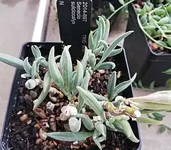 It is only 4 inches (10cm) tall and has tuberous roots, with dark green leaves that would have short white hairs. Flowers are white to mauve and may be yellow, which appear in spring.[2]