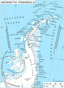 Curran Bluff (68°13′S 65°2′W / 68.217°S 65.033°W) is a bluff, 2 nautical miles (4 km) long, forming a part of the south coast of Joerg Peninsula, Bowman Coast, south of Reichle Mesa. The bluff rises to 910 metres (3,000 ft) at the west end and is the most prominent feature on the north side of Solberg Inlet. It was photographed from the air by Lincoln Ellsworth, 21 November 1935, and was mapped from these photographs by W.L.G. Joerg. It was named by the Advisory Committee on Antarctic Names for Martin P. Curran, a member of the Pine Island Bay reconnaissance survey in USCGC Burton Island, 1974–75, and Project Manager, RV Hero – Palmer Station Research System, 1976.[1]