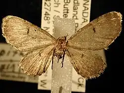 This species is rather similar to the wormwood pug, with warm brown forewings and a triangle of black spots close to the costa, but can be recognized by its broader wings and a more prominent white spot close to the tornus. Prout states - easily distinguished from absinthiata by its somewhat broader forewing, deeper colour, larger discal mark, more strongly developed subterminal spots, especially the posterior one, darker hindwing, with white dot or spot near anal angle, and especially by the spotted fringes. โ grisescens Dietze from Central Russia and Central Asia, is smaller and much more mixed with grey.[2] The wingspan is 17โ22 mm. [3][4]