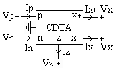 The CDTA element with its schematic symbol in Fig 1 has a pair of low-impedance current inputs and p, n and an auxiliary terminal z, whose outgoing current is the difference of input currents. Here, output terminal currents are equal in magnitude, but flow in opposite directions, and the product of transconductance () and the voltage at the z terminal gives their magnitudes. Therefore, this active element can be characterized with the following equations:
