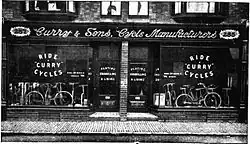 Henry Curry started to make bicycles in Painter Street Leicester in 1884, after leaving his previous employer N. Corah & Sons. Currys went public in 1927 when his four sons merged The Louth Bicycle Company, and the loose confederation of shops which the sons had run since their father's retirement in 1909, with the Nottingham-based Campion Cycle Company.[2]
