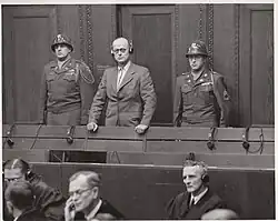 Following the German surrender, Rothenberger was arrested in Hamburg by British occupation troops and interned in Neumünster-Gadeland.[25] In the subsequent Nuremberg Trials, Rothenberger was brought up on charges in the so-called Judges' Trial that opened on 5 March 1947 against 16 high-ranking judicial officials and judges of the Nazi regime. Three former state secretaries of the Justice Ministry, Rothenberger, Klemm and Schlegelberger, were defendants in the trial.[26] He was charged with war crimes and crimes against humanity. He made one suicide attempt in his cell on 25 August.[27]