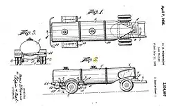 Patent drawing from Harold H. Robinson's Tank Trailer of 1931 (US2036607) - The Aerotank (1933). A liquid-carrying trailer for gasoline, oil, water etc., using the Aero Coupler to absorb shocks. Designed by Hugh Robinson's son Harold H. Robinson who later became Aerocar's president in 1937. The Aerotank was patented as a Tank Trailer (US 2,036,607[62] filed on 11 July 1933 and approved on 7 April 1936)