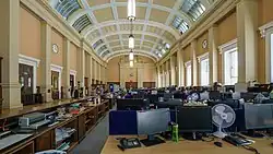 As originally built, the interior contained warehouses, cellars, about 170 offices, and a "Long room", measuring, 190 by 66 feet. On the ground floor was the "Queen's warehouse", with a rib-vaulted ceiling. The cellars in the basement were fireproof and used to store wine and spirits seized by the customs.[6]