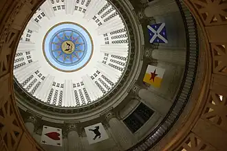 The tower was completed in January 1915 after four and a half years of work. It cost about $1.8 million to build. The tower contains a rotunda made of Vermont white marble covered by a dome. Outside of the top floor is a balcony, which, at the time of the tower's opening, was said to have views of Mount Wachusett, the Peterboro Hills, and the shores of Cape Ann.[9] The dedication ceremony was attended by Assistant Secretary of the Treasury Andrew James Peters, Collector Edmund Billings, Governor David I. Walsh, Mayor James Michael Curley, Cardinal William Henry O'Connell, Bishop William Lawrence, and the building's architect, Robert Swain Peabody.[10] The tower was opened on January 23, 1915. The clock on the upper tower of the building is 22 ft (6.7 m) in diameter. It was started at noon on April 6, 1916. The clock cost $2,500. Its hands were made of gold leaf painted[11] California redwood and weigh 101 and 141 pounds respectively.[12] Because of an undersized motor, the clock failed to work properly through much of the 20th century.[13] In 1960, the Great Seal of the United States was painted in the lobby's dome. Due to aging conditions, the clock's hands were replaced with carbon fiber in December 2020.[11][14]