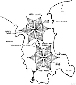 The extensive antenna system consists of two separate identical specialized umbrella antenna arrays, designated the "north array" and the "south array". Each array has a tall metal mast in the center, surrounded by twelve more masts in two concentric rings of six, all supporting a network of horizontal cables. The cables are arranged to form six diamond-shaped (rhombic) "panels" radiating from the central tower at angles of 60°, so each array has a snowflake shape when viewed from above. Each panel is suspended from four masts: the central one, two in the inner ring, and one in the outer ring. The two arrays normally operate together as one antenna, but each is designed to function independently to allow the other one to be shut down for maintenance.