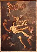 There are two paintings on the side walls of the vestibule by Daniel Seyter, the Martyrdom of St Catherine of Alexandria and the Martyrdom of St Lawrence. The first versions of these were painted by the Viennese artist between 1685 and 1686 using an unusual technique, oil on plaster. The paintings rapidly deteriorated and the best preserved fragments were sent to Massa by the cardinal to his nephew, Duke Carlo II Cybo-Malaspina in 1697. They were substituted with traditional oil paintings on canvas by the same Seiter between 1698 and 1700. The compositions remained similar.[5]