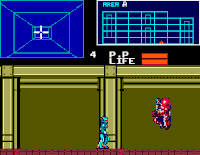 The game screen is divided into three sections. This includes a first-person view of the map, in which the player can see objects that are coming their way. There are two types of objects: red objects indicate the lower cyborgs, while white ones indicate the chief cyborgs. Next to it is a map of the area, the player's life and psycho power count. Below these is the main action screen, which is a side-on perspective of Paladin negotiating the environment and taking on enemies.