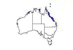 Cycas media is a palm-like cone-bearing plant widespread in seasonally dry tropical sclerophyll woodlands close to the east coast of Queensland, with scattered occurrences also in northern Northern Territory and Western Australia, Australia.[2][3] The dark green leathery, thick leaves are pinnately divided and grow in annual flushes from a massive apical bud. It is tolerant of bushfire and often re-foliates immediately following a dry season fire, before the beginning of the next rainy season. All plant parts are considered highly toxic. However, the seeds were eaten by Aboriginal Australians after careful and extensive preparation to remove the toxins.