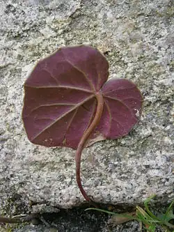 The shape of the leaves varies among the species and even among different specimens of the same species. Cyclamen hederifolium and Cyclamen repandum usually have leaves shaped like ivy, with angles and lobes, Cyclamen coum has nearly round leaves and Cyclamen persicum has heart-shaped leaves with a pointed tip. The leaf margin may be smooth, as in Cyclamen coum subsp. coum, or finely toothed, as in Cyclamen graecum.[14]