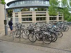 Bicycle stands outside the Centre for Mathematical Sciences at the University of Cambridge. Many students at the university opt to travel by bicycle.