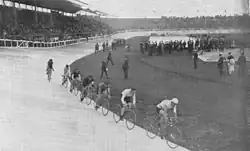 Meredith and Denny suffered punctures early on. Hansson fell near the end. Bonnet led most of the first half of the race. Kingsbury started his sprint shortly after the bell, "hotly challenged" by Jones, Werbrouck, and Weintz for "one of the most exciting finishes of the Games, which Kingsbury just won by three inches."[5]