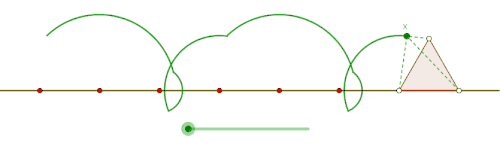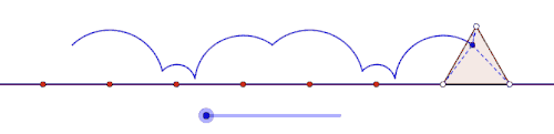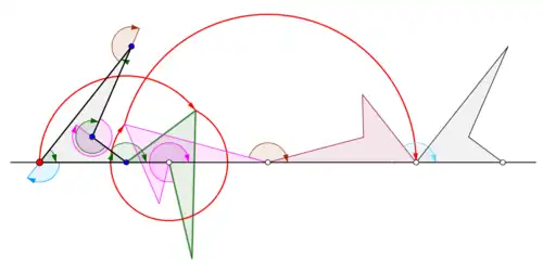 The cyclogon has an interesting property regarding its area.[3] Let A denote the area of the region above the line and below one of the arches, let P denote the area of the rolling polygon, and let C denote the area of the disk that circumscribes the polygon. For every cyclogon generated by a regular polygon,