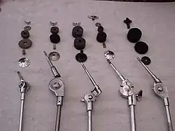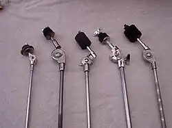 Simple boom stands. The rightmost one is specially configured to support a ride cymbal.
