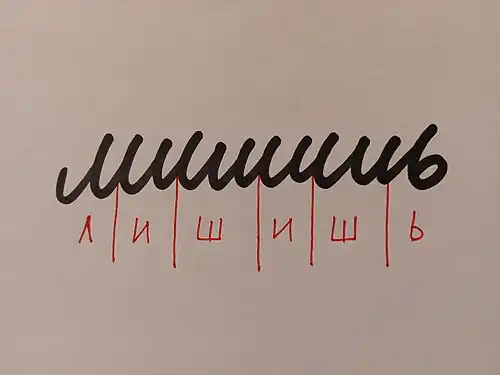There exists some ambiguity from the fact that several lowercase cursive letters consist (entirely or in part) of the element that is identical to the dotless Latin cursive letter ı, the cursive Greek letter ι or a half of the cursive letter u, namely и, л, м, ш, щ, ы. Therefore, certain combinations of these Russian letters cannot be unambiguously deciphered without knowing the language or without a broader context. For example, in the words волшебник, "magician" and домик, "little house" the combinations лш and ми are written identically. The word лишишь, "you will deprive" written in cursive consists almost exclusively of these elements. There are examples of different words that become absolutely identical in their cursive form, e.g. мщу "I avenge" and лицо (dative of лицо "face"). The most radical form of this, though not well known, is the Tajik word миллии meaning 'national'. It consists only of these elements.