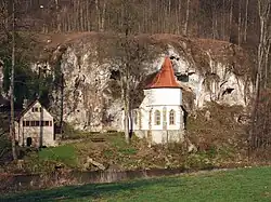 Between Dörzbach and Hohebach is situated, against a limestone-wall hillside (see photo), the chapel St. Wendel zum Stein with Mesnerhaus, in the same nature reserve. In the bands of rock, references are present from previous glacial inhabited caves.