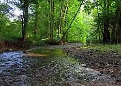 Dědina has many tributaries, but none of them is significant. In addition to natural tributaries, the river also receives water from the Alba canal, which connects the Dědina with the Bělá River.[4] The canal was gradually built from the end of the 14th century until 1550. It used to feed a system of fishponds, which no longer exist today. It is a historically important example of landscape modifications in the Middle Ages, which is protected as a cultural monument.[5]
