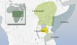 D'Arnaud's barbet (Trachyphonus darnaudii) is a species of bird in the family Lybiidae. Barbets and toucans are a group of near passerine birds with a worldwide tropical distribution. The barbets get their name from the bristles which fringe their heavy bills. Four geographical races (darnaudii, böhmi, emini and usambiro) have been recorded. The 2021 taxonomic update to the IOC World Bird List upgraded the usambiro subspecies to species status as Usambiro barbet / Trachyphonus usambiro.[3]