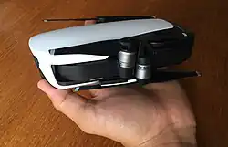 The Mavic Air was announced in January 2018 as a more portable development of the DJI Mavic.[1][2] Like the Mavic, the Mavic Air is a foldable quadcopter, though the arms and propellers fold to be flush with the side of the drone as opposed to the Mavic's over/under configuration.[1] This allows the Mavic Air to be half the size of the Mavic Pro and at 430 grams (0.95 lb) is 41% lighter.[2] The Mavic Air is which was equipped with a 1/2.3" CMOS camera with a 24 mm lens on a 3-axis gimbal capable of capturing 4K video at 30 Frames per second (FPS) and 1080p video at 120FPS.[2] The camera has a new panorama mode, which stitches together 25 photos in eight seconds to create a "Sphere Panorama".[1] The Air also has a SmartCapture feature, a three-directional obstacle avoidance system with seven sensors, and a 2375 mAh battery giving it a maximum flight time of 21 minutes.[2][3][4] Due to antennas mounted on its landing gear, the drone has a 2.5 mile range.[1] Like the DJI Spark, the Mavic Air also features the "Smart Capture" mode, in which the drone can be controlled by hand gestures.[5]