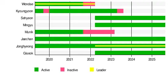 On February 28, Dongyo Entertainment announced the departure of Munik from the group.[38] In addition, on April 19, it was announced that Kyoungyoon would temporarily suspend his activities with the group for medical issues.[39] On August 7, the agency announced the departure of Kyoungyoon from the group and his military enlistment.[40]