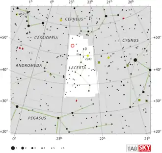 | Nova Lacertae 1950, DK Lac, AAVSO 2245+52, 2MASS J22494690+5317192. Gaia DR2 2002440098459791744[5] | |