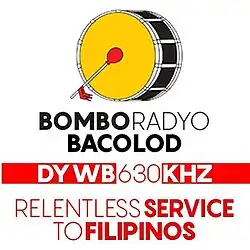 DYWB (630 AM) Bombo Radyo is a radio station owned and operated by Bombo Radyo Philippines through its licensee People's Broadcasting Service. Its studio and transmitter are located at Bombo Radyo Broadcast Center, Lacson St., Brgy. Mandalagan, Bacolod. During the station's off-air hours, the spill-over signals of Manila-based DZMM and Vietnam-based Voice of Vietnam can be heard on this frequency.[1][2][3][4][5][6]
