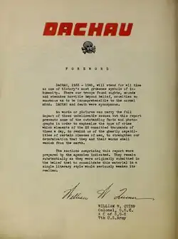 Dachau is a 72-page investigation report by the 7th US Army on Dachau, one of the concentration camps established by Nazi Germany. The report details the mass murder and mass atrocities committed at Dachau by the SS and other personnel. Following the liberation of the camp by the 7th US Army on 29 April 1945, the report was prepared during the following one or two weeks and published in May. In addition to a preface, the report contains three independent reports which partly overlap thematically. Although it contains some errors, the report is considered one of the first studies on the Nazi concentration camps.