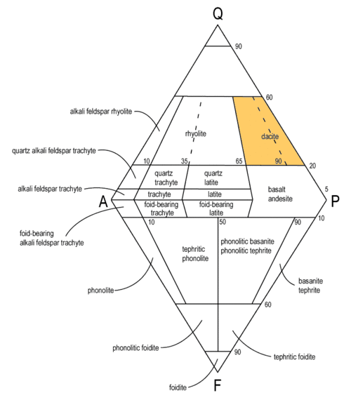 The relative proportions of feldspars and quartz in dacite, and in many other volcanic rocks, are illustrated in the QAPF diagram. This defines dacite as having a content of 20% to 60% quartz, with plagioclase making up 65% or more of its feldspar content.[5][6][7][8] However, while the IUGS recommends classifying volcanic rocks on the basis of their mineral composition whenever possible, dacites are often so fine-grained that mineral identification is impractical. The rock must then be classified chemically based on its content of silica and alkali metal oxides (K2O plus Na2O). The TAS classification puts dacite in the O3 sector.