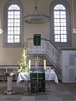 Dackenheim Protestant church: view of the inside with the altar, font and pulpit