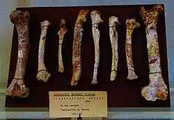 Due to the lack of clear evidence of the phalanges of Dacrytherium as opposed to its relatives Anoplotherium and Diplobune, speculations of the number of fingers it had ranged from three fingers[42][43] to four fingers[36][44] in the 19th–20th centuries. While not rich in postcranial evidence like Anoplotherium or Diplobune, Dacrytherium is known from some limb bones, including astragali in the cases of D. elegans and D. ovinum.[28][27]