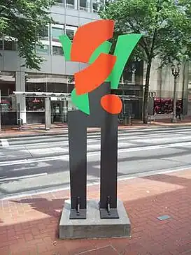 Daddy Long Legs (2006) was designed by Mel Katz and installed along the Portland Transit Mall at the intersection of Southwest 6th Avenue and Stark in downtown Portland. Laser cutting was completed by BBC Steel in Canby, masking was executed by Aztec Sign and Graphics, and painting was done by Dura Industries, both based in Portland, respectively. The aluminum sculpture is flat but appears dimensional due to its painted interior shapes. The artist named the work Daddy Long Legs because of its "elongated black shapes and welded base plates", which are reminiscent of pant legs.[2]
