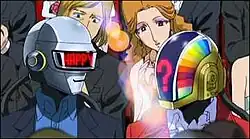 Daft Punk's popularity has been partially attributed to their appearances in mainstream media.[119] They appeared with Juliette Lewis in an advertisement for Gap, featuring the single "Digital Love", and were contractually obliged to appear only in Gap clothing. In 2001, Daft Punk appeared in an advertisement on Cartoon Network's Toonami timeslot, promoting the official Toonami website and the animated music videos for their album Discovery.[133] The music videos later appeared as scenes in the feature-length film Interstella 5555: The 5tory of the 5ecret 5tar 5ystem, in which Daft Punk make a cameo appearance as their robot alter-egos. They appeared in a television advertisement wearing their Discovery-era headgear to promote Sony Ericsson's Premini mobile phone. In 2010, Daft Punk appeared in Adidas advertisements promoting a Star Wars clothing line.[142] Daft Punk made a cameo in Tron: Legacy as nightclub DJs.[50]